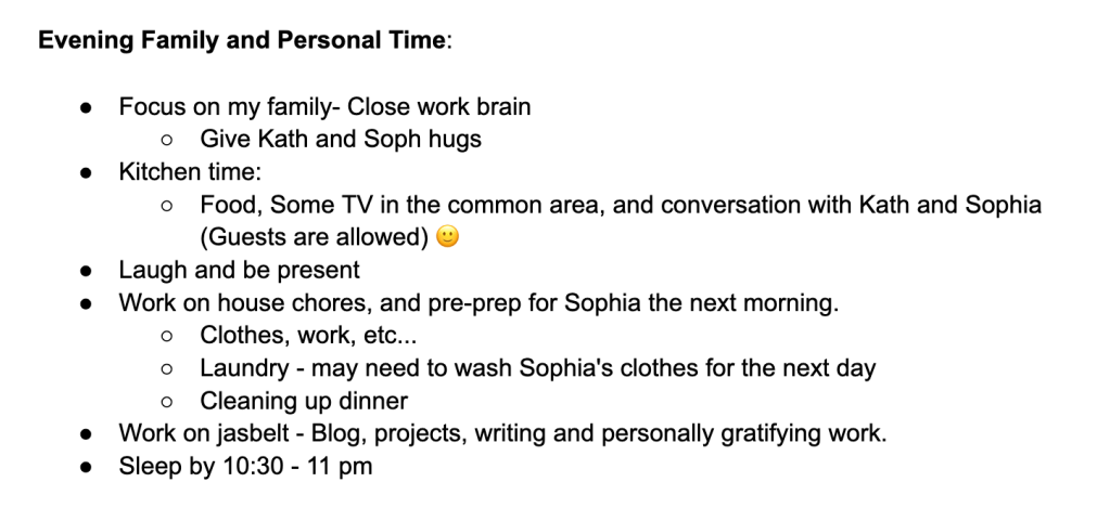 What has worked for me 90% of the time is a simple exercise called the ideal day. You sit down with a sheet of paper or a note-taking app on a device and then write down the key things you want to do each day in milestones. Then you review and assign timeblocks to these. You will have personal things and work things. Typically for people who work during the day your personal time will start in the AM, followed by some family time for school prep, etc, and then work time, followed by more personal time or family time.
